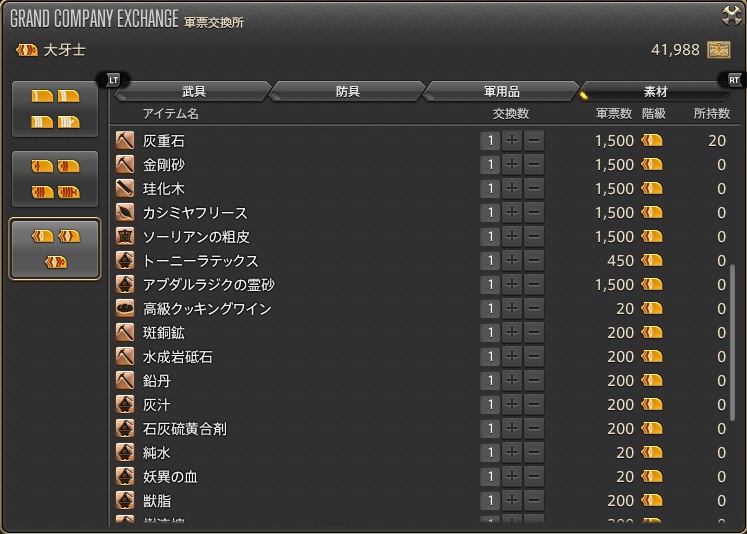 グランドカンパニーで購入した素材(その他素材は、採集もしくは、マケボで購入)